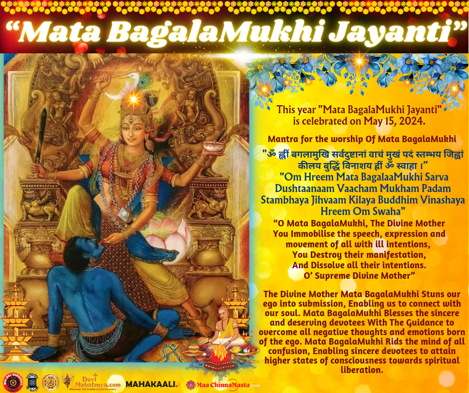 This year “Mata BagalaMukhi Jayanti” is celebrated on May 15, 2024. Mantra for the worship Of Mata BagalaMukhi “ॐ ह्लीं बगलामुखि सर्वदुष्टानां वाचं मुखं पदं